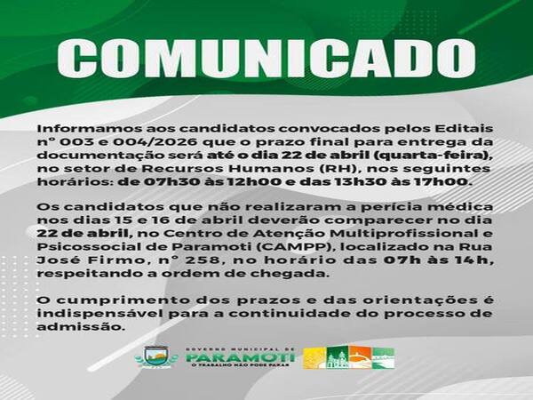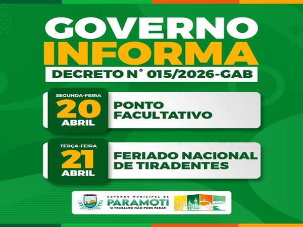 Nesta data, celebramos o Dia do(a) Prefeito(a), reconhecendo a importância de quem exerce, com responsabilidade, dedicação e compromisso, a missão de administrar e promover o desenvolvimento do nosso município. Ser prefeito(a) é dedicar-se diariamente ao cuidado com as pessoas, à promoção do bem-estar coletivo e à construção de políticas públicas que contribuam para o progresso e a qualidade de vida da população. Seguimos firmes na construção de uma Paramoti cada vez melhor para todos. Feliz Dia do(a) Prefeito(a)! #GovernoMunicipaldeParamoti #68AnosdeEmancipaçãoPolítica #ParamotiTerradoMel #OTrabalhoNãoPodeParar