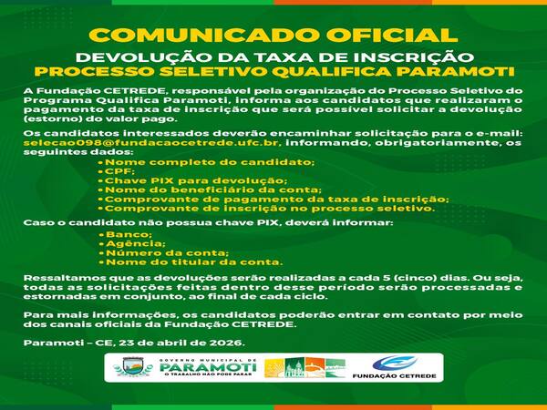 Na manhã deste domingo, 19 de abril de 2026, o Prefeito em Exercício, Airton Mateus, acompanhado dos Secretários Municipais, participou na Praça de Eventos Luiz Catirina, da concentração e da largada do 5º Trilhão da Paz, evento já consolidado no calendário dos apreciadores de atividades fora da estrada no município de Paramoti.